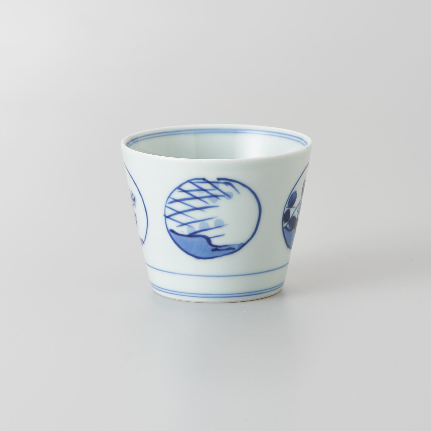 落ち着いた雰囲気のある絵柄です。丸の中に、野に咲く花や植物が描かれています。そば猪口としてはもちろん、コーヒー、デザート碗としてもいろいろなシーンで活躍します。